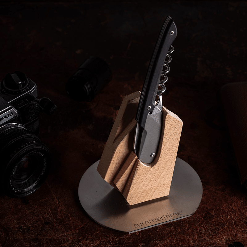 Support vertical aimanté, ce socle d’accueil repose sur une platine en acier inoxydable signée SummerTime®. Sculpté dans un bois de hêtre noble, « Stand SummerTime » donne un véritable supplément d’âme à vos moments de dégustation et de partage. Fabriqué dans les règles de l’art, à la main dans notre atelier, à Thiers (France), cet objet singulier permet de créer une ambiance nouvelle autour du vin. Posé sur son stand, votre sommelier tire-bouchon SummerTime attire tous les regards, toutes les convoitises.